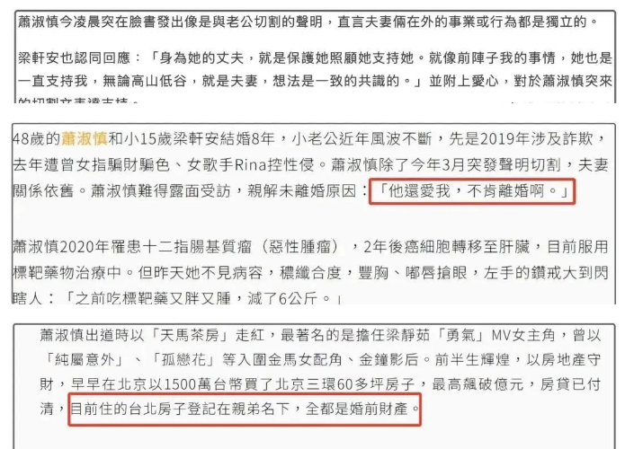 曾经被视为“金童玉女”的结合,早已在岁月里显露出千疮百孔的本质。八年婚姻路上,丈夫梁轩安的名字一次次与丑闻相连:金钱纠纷、情感欺骗,甚至被指控性侵女歌手Rina。今年三月,萧淑慎在社交媒体上公开喊话“冤有头债有主”,决裂之态尽显,外界皆以为离婚已成定局。
